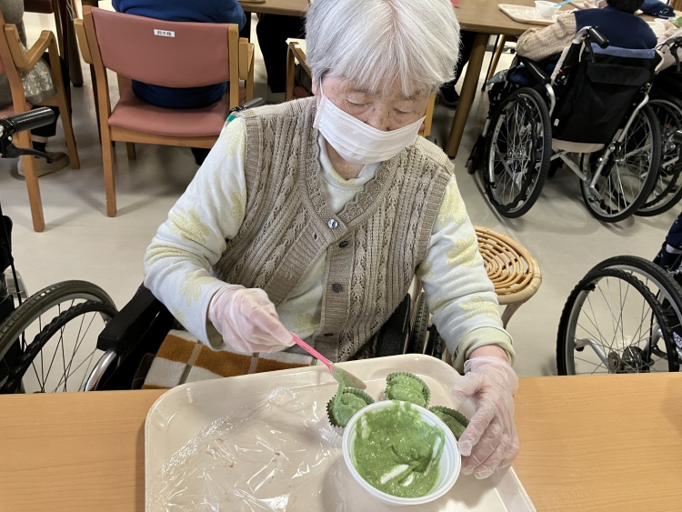 今月も調理レクを行いました。季節感を味わっていただこうと思い、職員がヨモギを摘んできました。